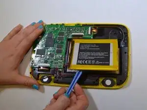 Аккумулятор приклеен к черной пластиковой панели. Используйте пластиковый инструмент для открытия, чтобы поддеть аккумулятор от черной пластиковой панели.