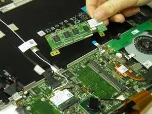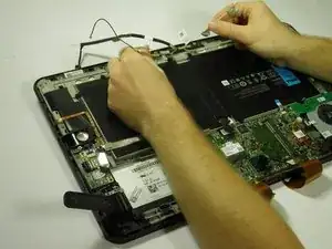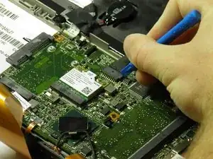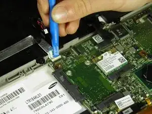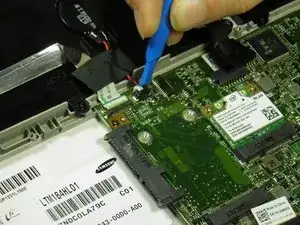 Используйте наклонный край пластикового инструмента для открытия, чтобы отсоединить черные и белые провода, подключенные к беспроводной WLAN-карте.