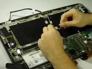 Используйте наклонный край инструмента для открытия, чтобы поднять зажимы, удерживающие кабели экрана и материнской платы.