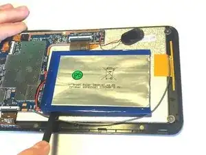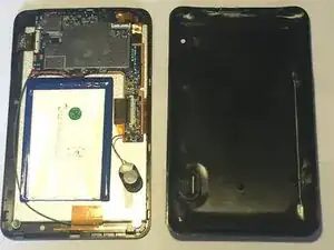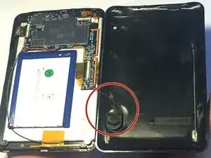 Положите устройство и обратите внимание, что динамик прикреплён к задней крышке проводом. Аккуратно отожмите динамик вверх от задней крышки и поместите его рядом с аккумулятором.