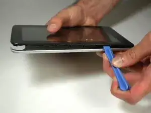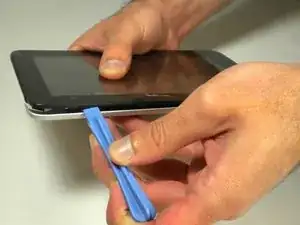 Вставьте пластиковый инструмент для открытия между серебристой задней панелью и экраном. С угла устройства с любой стороны подденьте шов устройства примерно на 2.5 см.