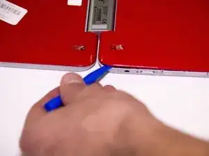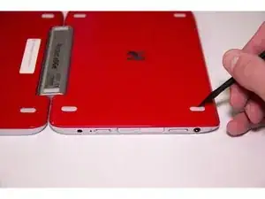 С помощью пластикового инструмента для открывания поднимите заднюю крышку с обеих сторон устройства и снимите ее.