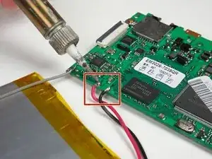 Удалите красный и черный провода аккумулятора с платы с помощью инструмента для удаления припоя.