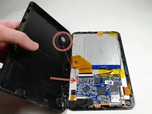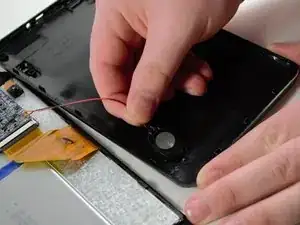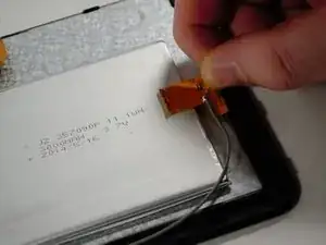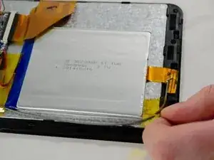 Пальцами отделите ленточный провод от аккумулятора и задней части дисплея.