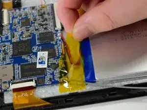 Снимите жёлтую ленту, удерживающую провод, соединяющий аккумулятор с материнской платой, пальцами.