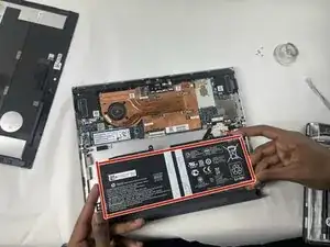 Удалите шесть винтов Philip #1 длиной 3,5 мм, которые крепят аккумулятор к корпусу дисплея.