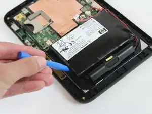 Отсоедините фиксатор аккумулятора с помощью пластикового инструмента для открывания.