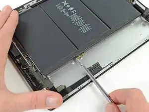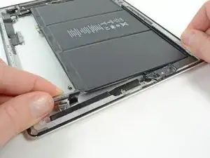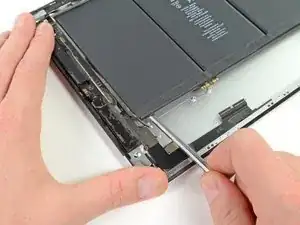 Антенна прикреплена к нижней части iPad винтами и кабелем. Этот шаг отделяет антенну от передней панели, гарантируя, что при снятии панели антенна не будет повреждена.
