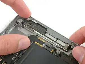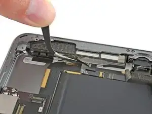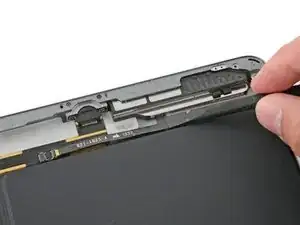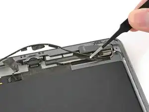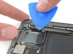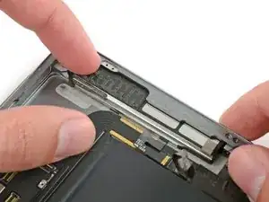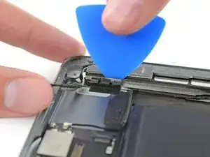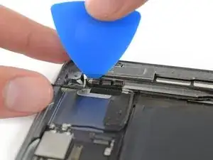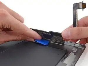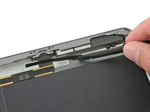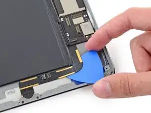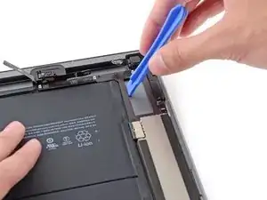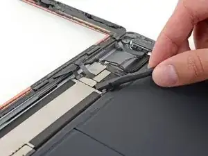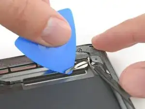 Поверните два медиатора в левых углах iPad, чтобы немного приподнять дигитайзер, отделяя оставшийся клей в процессе.