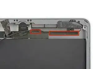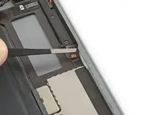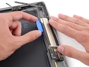 При выполнении следующих шагов по поддеванию клея, удерживающего логическую плату, всегда сначала пробуйте аккуратно, чтобы проверить, размягчился ли клей. Если нет — повторно нагрейте iOpener и приложите его к задней крышке.