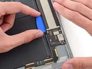 Поднимайте край логической платы медленно. Если почувствуете значительное сопротивление, прекратите поддевание и повторно примените iOpener.