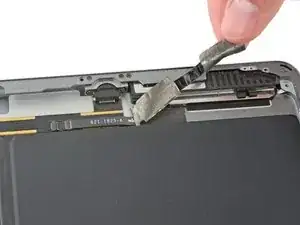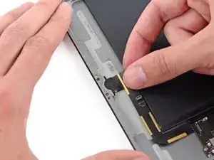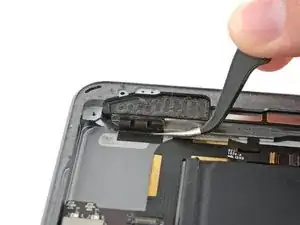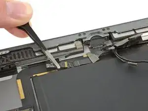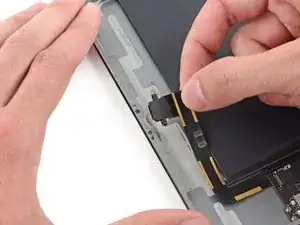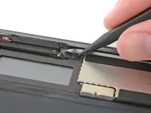 Плоским концом лопатки отсоедините разъем кабеля микрофона от логической платы.