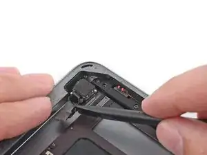 Остроконечным концом лопатки переверните фиксирующий язычок разъёма кабеля верхнего блока кнопок.