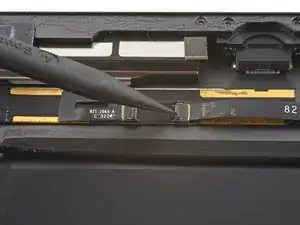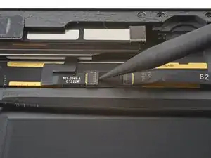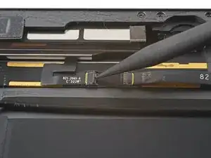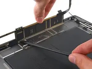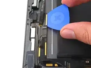Поддерживая дигитайзер, проведите пике между двумя шлейфами дисплея, чтобы разъединить оставшийся клей.