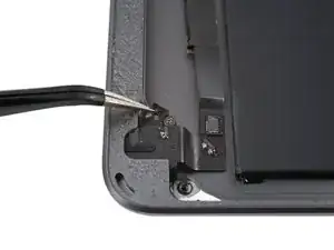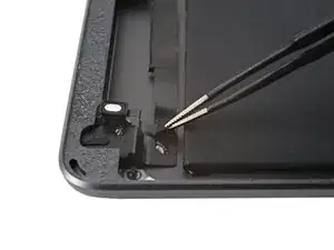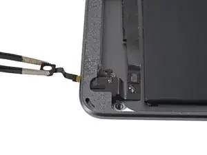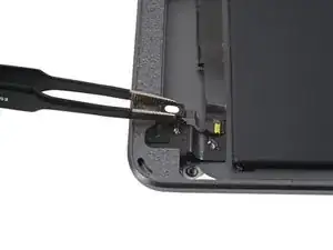 Перед установкой нового аккумулятора протестируйте его: сначала заново установите плату логики, подключите ZIF‑разъем кабеля управления кнопками и разъем прижима LCD. Затем снимите блокиратор аккумулятора и снова установите винт разъема аккумулятора. Включите iPad, чтобы убедиться, что он работает. После этого вернитесь назад через этот шаг и приклейте аккумулятор.