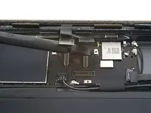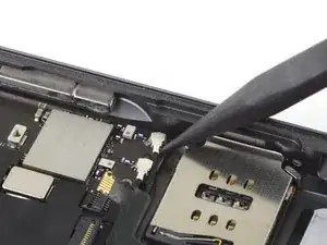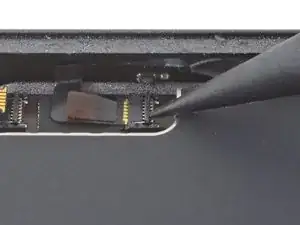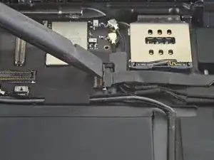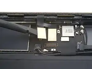 Вставьте инструмент для открытия под верхнюю часть логической платы и сдвиньте его в сторону логической платы, чтобы разрезать клей, фиксирующий ее к задней панели.