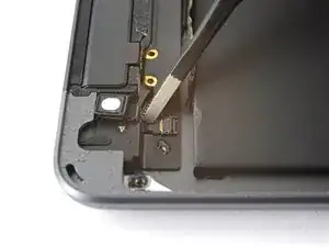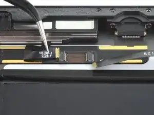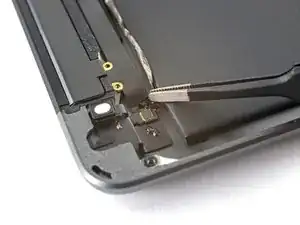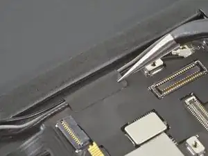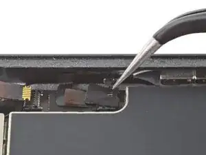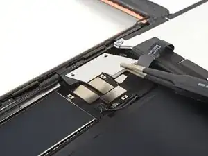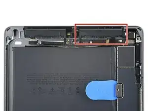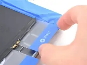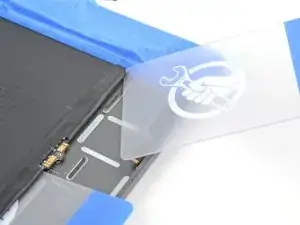 Перед установкой новой батареи протестируйте ее, сначала вставив плату управления, подключив кабель ZIF управления кнопками и разъем нажимной матрицы. Затем уберите блокировщик батареи и снова установите винт разъема батареи. Включите iPad, чтобы убедиться, что он все еще работает. Вернитесь к этому шагу и затем приклейте батарею.