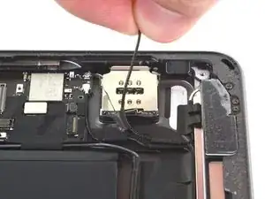 Приклейте нижний край полоски на заднюю крышку над динамиками и нижними антеннами.
