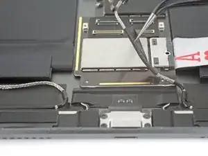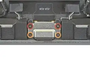 Удалите два винта Phillips 1.3 мм, фиксирующие скобу крышки разъёма дисплея.