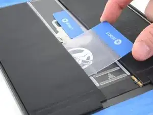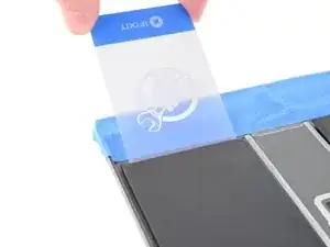 Вставьте другую пластиковую карту под верхнюю часть правого элемента батареи.