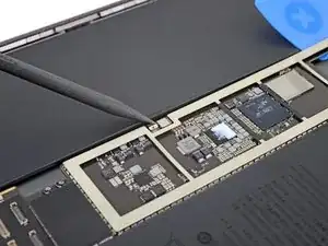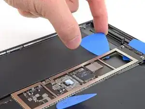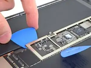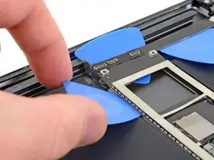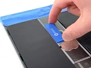Вставьте ещё одно лезвие-подкладку под верхний левый угол логической платы.