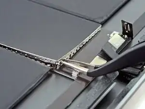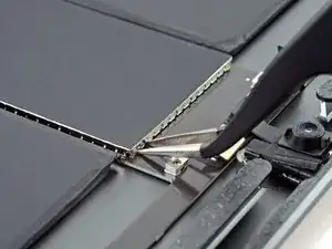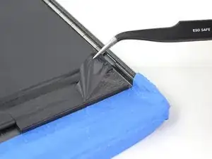 С помощью пинцета снимите две полоски ленты, фиксирующие батарею к нижним буферным блокам.