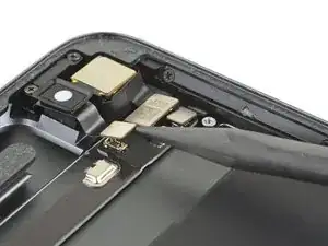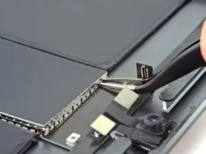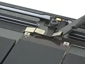 Используйте лопатку, чтобы отсоединить два видимых гибких разъёма дисплея, аккуратно поддев их и выпрямляя вверх из разъёмов.
