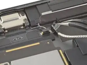 Используйте пинцет, чтобы отсоединить антенный кабель от логической платы, подняв кабель как можно ближе к разъёму.
