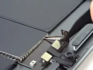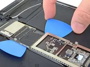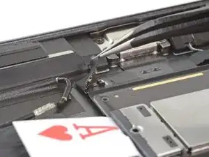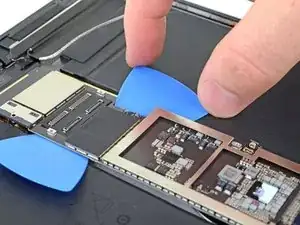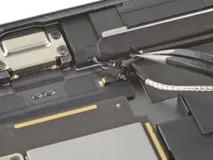Используйте пинцет, чтобы отлепить правый антенный кабель от логической платы.
