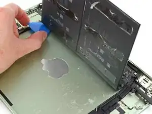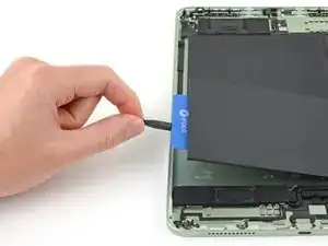 Просуньте медиатор под плату аккумулятора, чтобы отделить клей, фиксирующий её к рамке.