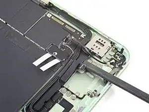 Используйте заострённый конец лопатки, чтобы отсоединить кабель нижнего динамика, поддев и тянув вверх заднюю часть разъёма.