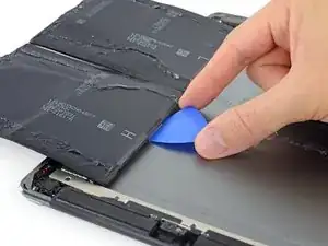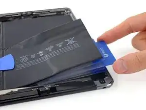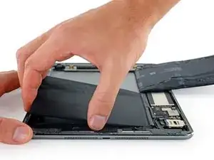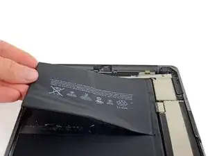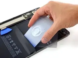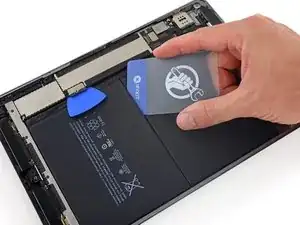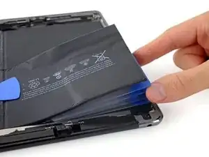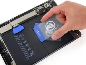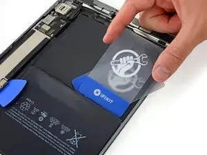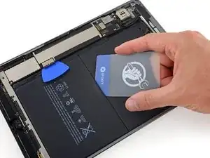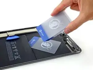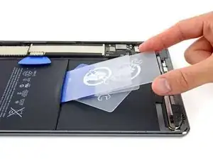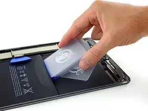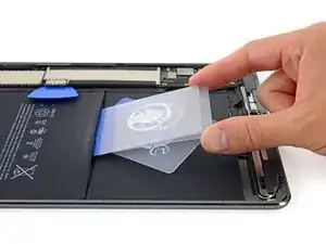 Снова подденьте угол пластиковой карты под верхнюю ячейку батареи, ближе к левому краю iPad.