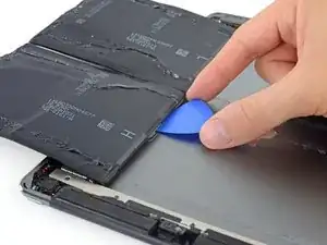 Начиная с середины iPad, вставьте угол пластиковой карты под верхнюю ячейку батареи.