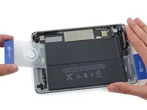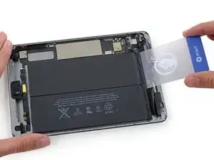 В течение следующей процедуры вы будете просовывать тонкие пластиковые карточки между аккумулятором и задней крышкой iPad, чтобы отделить адгезив, фиксирующий аккумулятор. Старайтесь держать карточки как можно более плоскими, чтобы не изогнуть аккумулятор — это может повредить его и вызвать утечку опасных веществ.