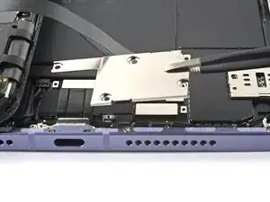 Будьте осторожны, чтобы не проколоть и не согнуть аккумулятор инструментом — проколотый или согнутый аккумулятор может протечь, выделять опасные химические вещества или привести к возгоранию. Если вам трудно поднять аккумулятор, нанесите больше изопропилового спирта и попробуйте снова.