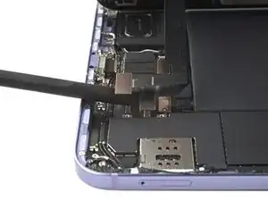 Используйте плоский конец лопатки, чтобы поддеть и отключить два прижимных разъёма кабеля дисплея, закреплённых на рамке.