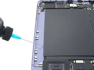 В этом iPad для удержания аккумулятора используются как клей с механизмом растяжения, так и обычный клей. Используйте большое количество высококонцентрированного изопропилового спирта, чтобы помочь отделить аккумулятор и очистить остатки клея.
