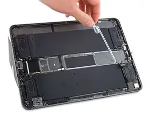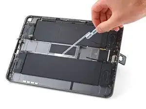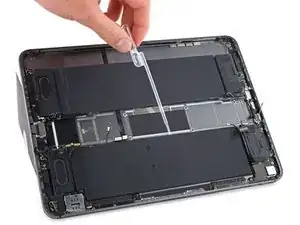 Вставьте медиатор под правый край логической платы над кабелями левого микрофона и зарядки Apple Pencil.
