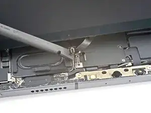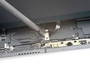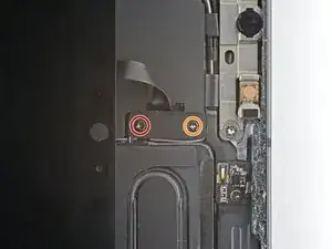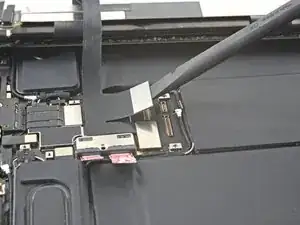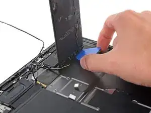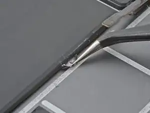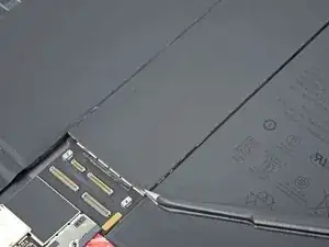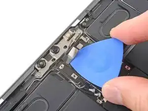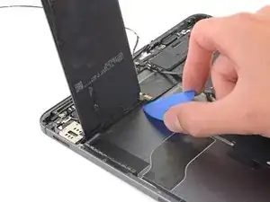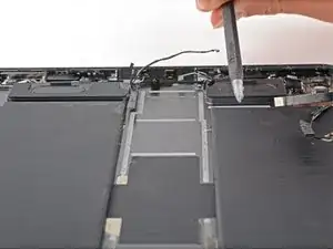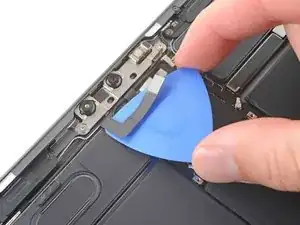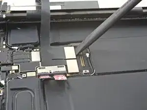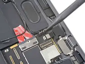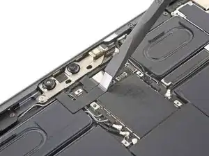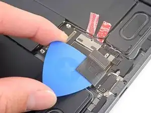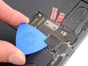 Используйте плоский конец лопатки, чтобы отсоединить кабели левого микрофона и зарядного устройства Apple Pencil.