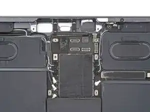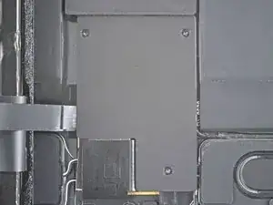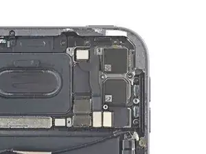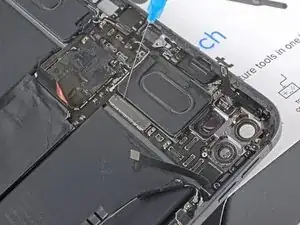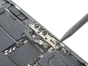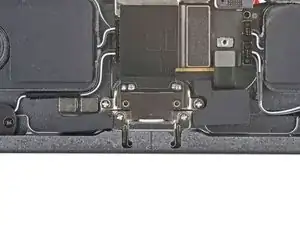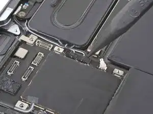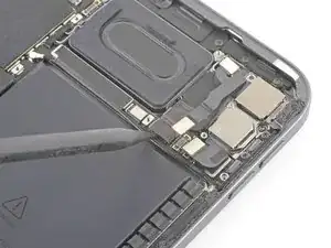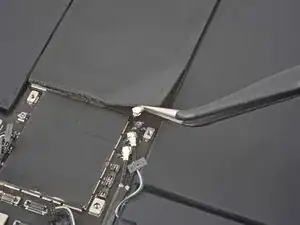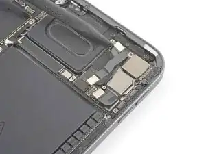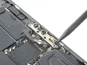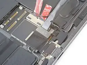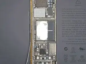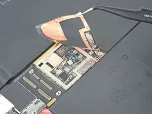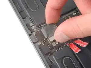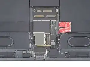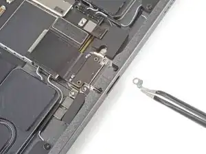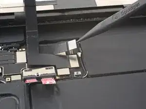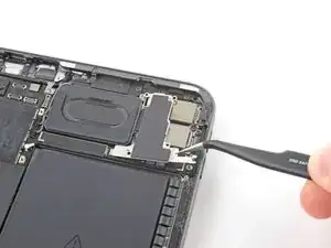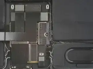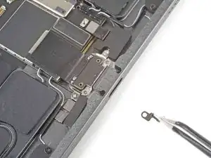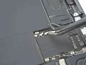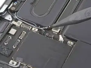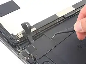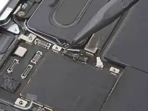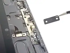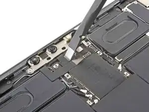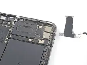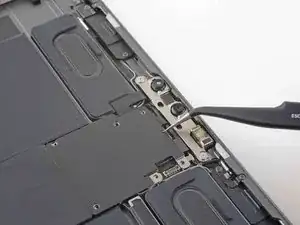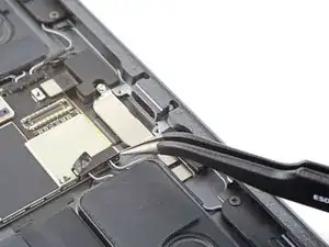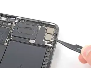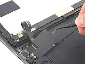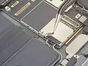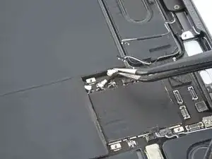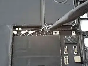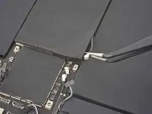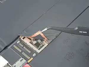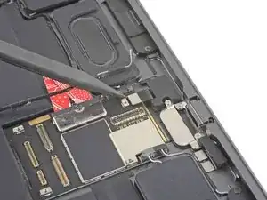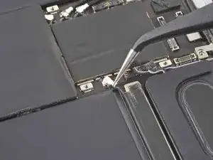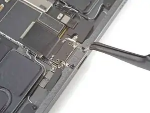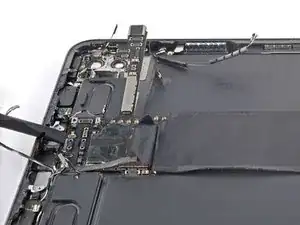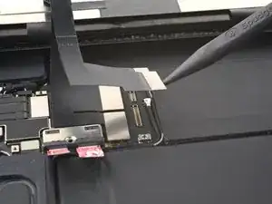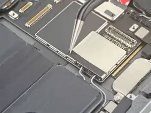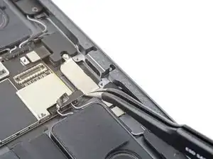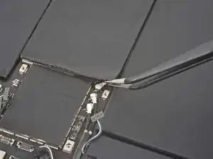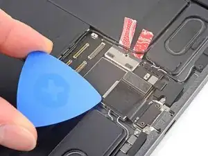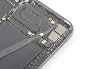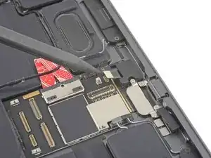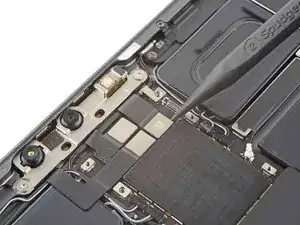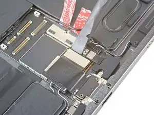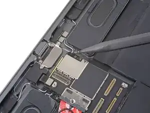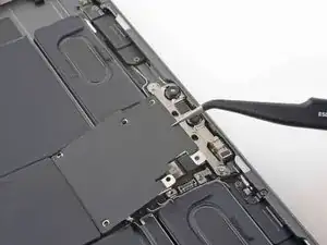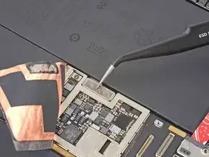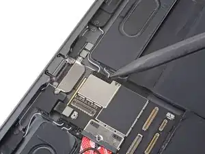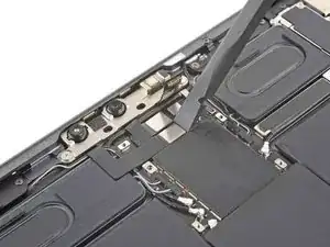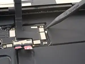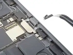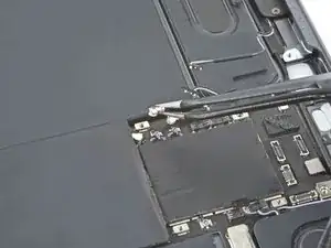 Используйте пинцет или пальцы, чтобы отогнуть экранную защиту платы логики и получить доступ к кабелям левого микрофона и зарядного устройства Apple Pencil.