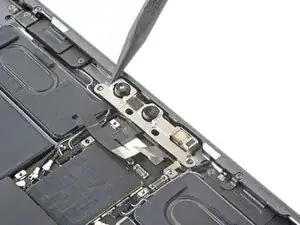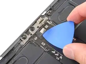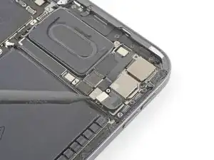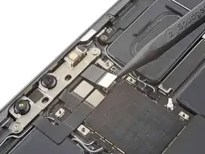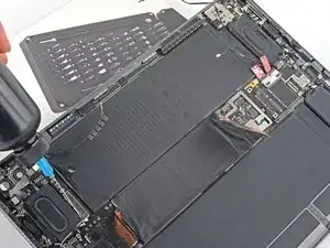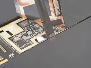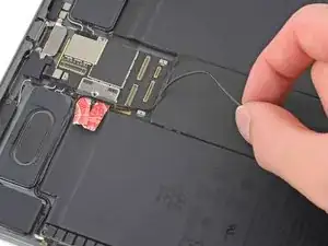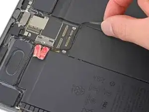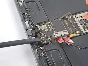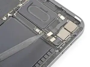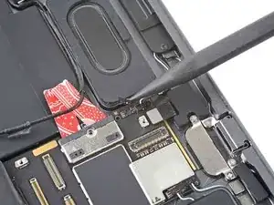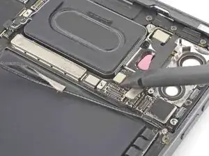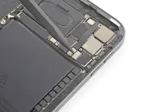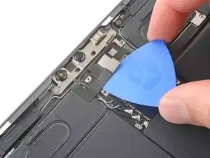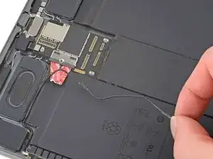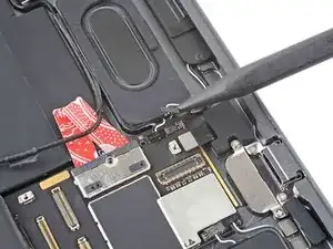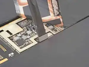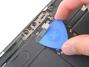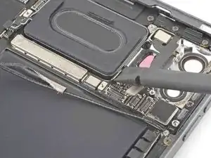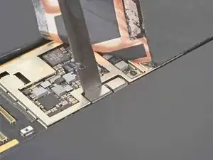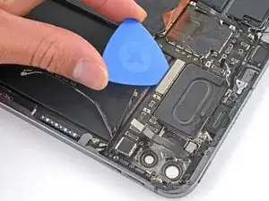 Заведите медиатор под правый край платы логики над кабелями левого микрофона и зарядки Apple Pencil.