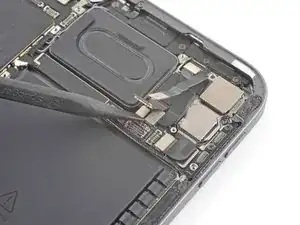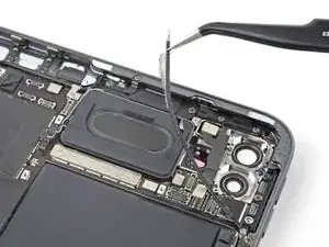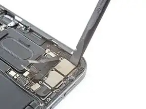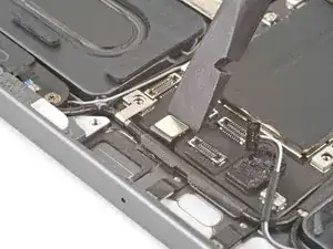 Используйте пинцет, чтобы вытащить и удалить скобу кабеля динамика в левом нижнем углу.