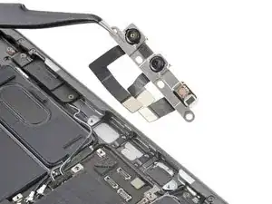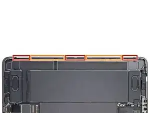 Верхний край iPad содержит модуль камеры, два датчика освещённости, датчик приближения и передний микрофон. Эти компоненты хрупкие и легко повреждаются, если инструмент для поддевания вставлен слишком глубоко. Разделяйте клей только в отмеченных местах, чтобы избежать повреждений.