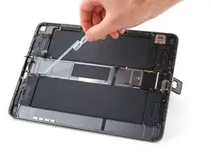 Используйте плоский конец лопатки, чтобы отключить кабели левого микрофона и зарядного устройства Apple Pencil.