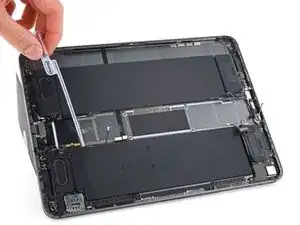 Вставьте расширительный инструмент под правый край логической платы выше кабелей левого микрофона и зарядного устройства Apple Pencil.