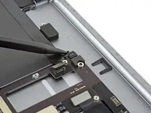 Используйте пинцет, чтобы аккуратно приподнять левый антенный кабельный разъём от рамы.