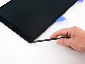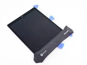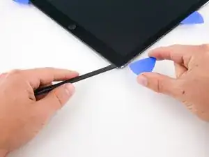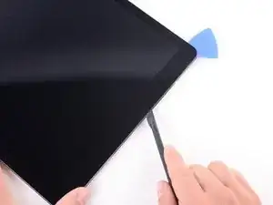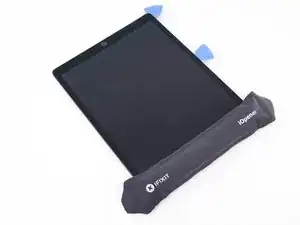 Используйте монтажную лопатку, чтобы рассечь клей вдоль верхней левой стороны iPad. Если резание затрудняется, повторно нагрейте кромку и попробуйте снова.