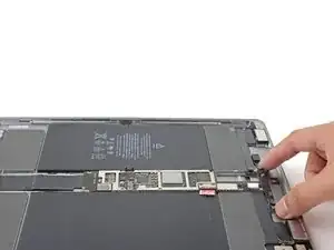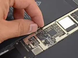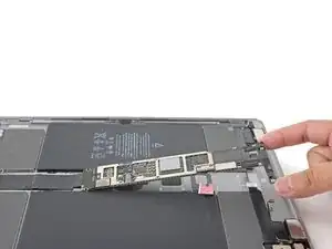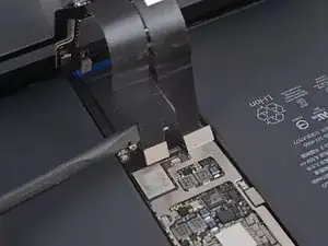 Не пытайтесь полностью снять плату. Она прикреплена гибким кабелем, который приклеен к раме iPad.
