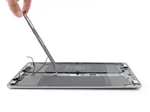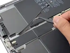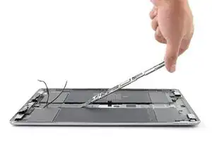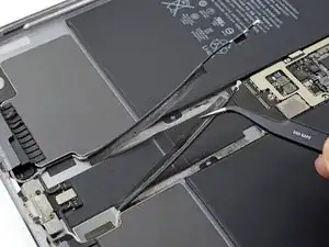 Используйте пальцы или пинцет, чтобы приподнять и отклеить два антенных кабеля от рамы iPad.