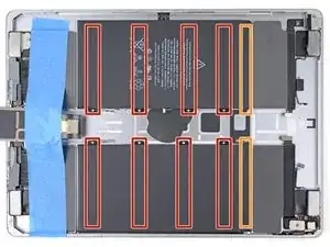 В этом iPad для фиксации аккумулятора используются как адгезив со свойством растягивания при высвобождении, так и обычный клей. Используйте большое количество высококонцентрированного изопропилового спирта или средство для удаления клея iFixit, чтобы облегчить извлечение аккумулятора и очистить остатки клея.